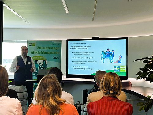 Berlin, 21.06.2024 - Die Deutsche Kleiderstiftung war gestern Gastgeberin für den zweiten Summit Zukunftstage Altkleiderspende des Dachverbandes FairWertung e.V.. Zahlreiche Gäste aus den Bereichen gemeinnützige Kleidersammlung, aber auch von Unternehmen und Verbänden sowie aus der Politik kamen zusammen, um das Thema Altkleiderspende aus unterschiedlichen Blickwinkeln zu betrachten. Drei Schwerpunkte prägten den Tag: Digitalisierung, E-Commerce, Upcycling.