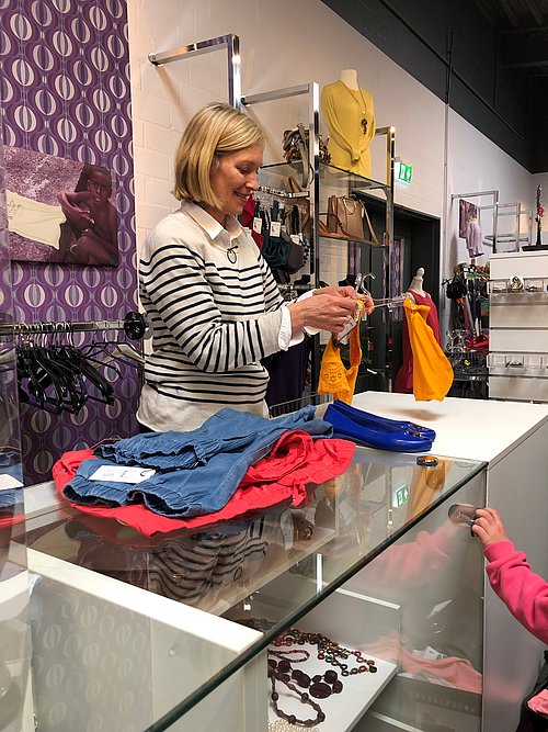 So auch an der zweiten Station, dem Zweimalschön Charity Shop in Helmstedt. Filialleiterin Steffi Nickel freut sich sehr über den Besuch aus Berlin und erklärt Katja Weitzenböck sogleich das Kassensystem. Es ist viel los, Kinder spielen in den Kabinen, einige Frauen beraten sich gegenseitig in ihrer Kleiderwahl. Auch ukrainische Frauen sind unter den Kund*innen, denn die Deutsche Kleiderstiftung begrüßt die neuen Helmstedter mit einer kostenlosen Ausstattung in dem Zweimalschön Charity Shop in der Straße Magdeburger Tor 15. Im Gespräch mit einer Ukrainerin geht es um ein Alltagsproblem, das auch Katja Weitzenböck kennt. Eine Mutter möchte für Ihre Tochter gerne Kleidung aussuchen, ist sich aber sehr unsicher. Mit kritischen Teenagern kennt sich Katja Weitzenböck aus: „Meine Tochter ist auch sehr bestimmt in ihrer Kleiderauswahl. Ich kenne das Problem.“ Sie lacht und packt dabei die ausgewählten Kleidungsstücke der Mutter ein.