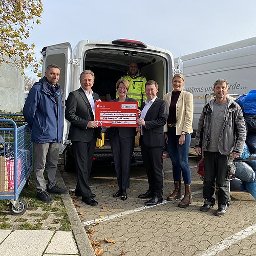 Braunschweig, 22.11.2023 - Die Braunschweigische Landessparkasse sammelt fast schon traditionell einmal jährlich für uns Kleidung innerhalb der Mitarbeitenden. In diesem Jahr freuen wir uns nicht nur über einen großen Berg an guterhaltenen Textilien und Schuhen, sondern auch über 2.000,- €, mit denen unsere Projektarbeit gefördert wird. An Markus Böck, Verantwortlicher für Öffentlichkeitsarbeit bei der Kleiderstiftung, übergaben Dr. Ingo Lippmann, Vorstandsvorsitzender, sowie Tanja Dresselmann und Lars Dannheim, Vorstandsmitglieder, und Pia Schneider, eine der Initiatorinnen der Kleiderspende, den Scheck (von links). Mike Festerling (re.) und Benjamin Krause (im Hintergrund) beluden fleißig unseren Transporter mit den vielen Säcken, Taschen, Kartons. Vielen Dank an alle Spenderinnen und Spender!